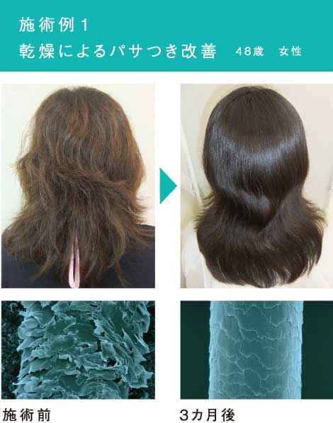 | 3. ツヤと手触りはもちろん、カラー・パーマの持ちも向上 キューティクルが修復されることで栄養や水分の流出が防がれ、自然なツヤ、しなやかな指通り、ハリ・コシが蘇ります。また、毛髪内部のSS結合も補われるため、パーマやカラーの定着率も改善するとされています。 |